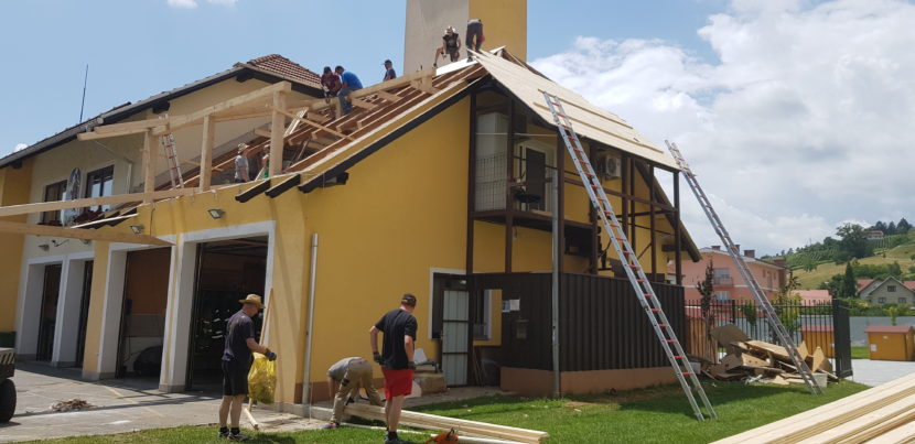 Dela smo se lotili v nedeljo 10. 06. 2018 v zgodnjih jutranjih urah. Začelo se je z razkrivanjem stare opeke, rekonstrukcijo in dodelavo lesene konstrukcije ostrešja, kjer smo le tega povečali.